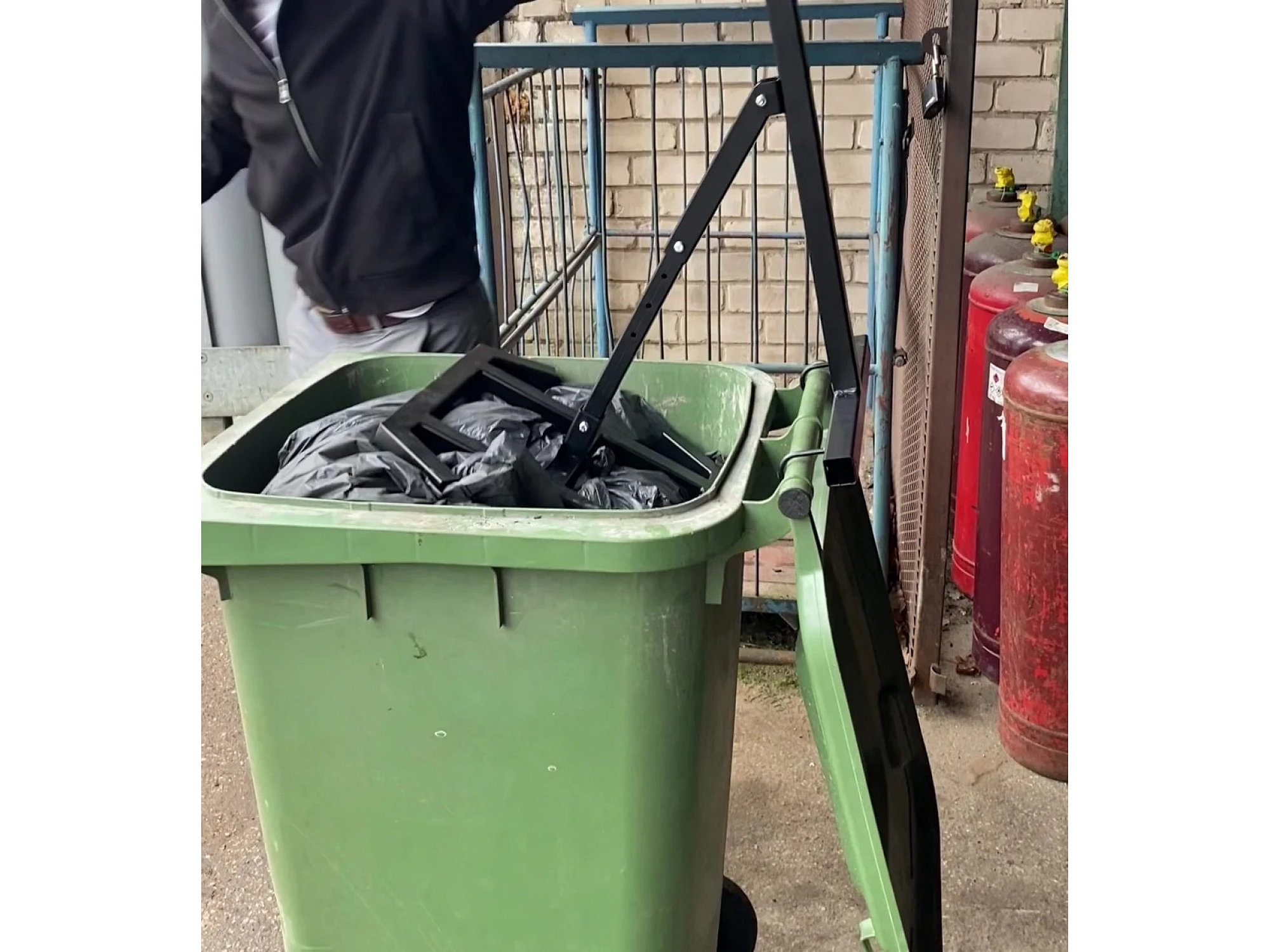 Пресс для мусора надежно крепится к ручкам мусорных контейнеров, обеспечивая устойчивость во время использования. Это позволяет эффективно уплотнять отходы, уменьшая пустое пространство в контейнере и максимально увеличивая его объем.